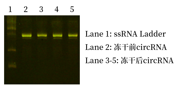 对冻干前、及冻干后复溶的circRNA进行E-gel电泳检测,分析其完整性和纯度。结果显示,冻干前后的circRNA条带无明显差异,3组冻干后样品显示出很好的重复性。
