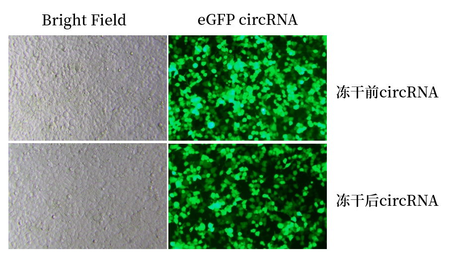 我们使用一款商业化转染试剂,将冻干前与冻干后复溶的circRNA样品转染至293T细胞。结果显示,冻干前后的eGFP circRNA样品均观察到较强的荧光信号。
