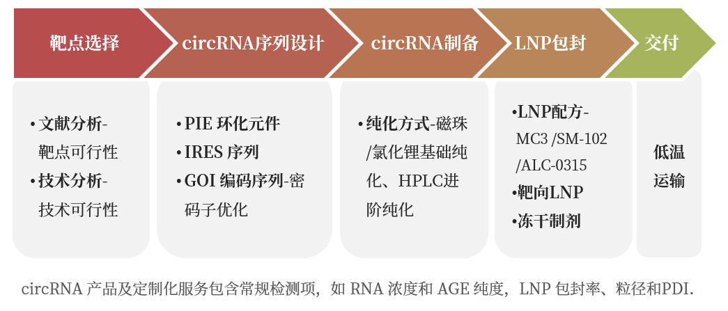 青鸟核酸(RNASci)提供circRNA预制产品和一站式circRNA定制化解决方案,服务流程涵盖靶点评估、circRNA序列设计、体外转录(IVT)、环化、circRNA纯化、LNP包封、分析与检测。 交付产物类型:IVT转录模板(质粒DNA)、或circRNA、circRNA-LNP(ug到mg级别)。