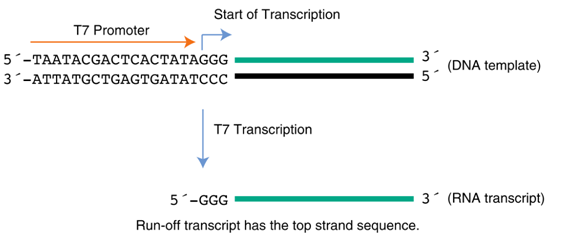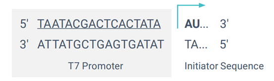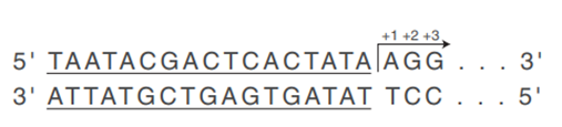 首先是GG模板,序列为:5’-TAATACGACTCACTATAGGG…-3’。 GG模板来源于III级T7启动子(T7 promoter class III),适用于GG类型的帽类似物,如第一代帽类似物m7G(5’)ppp(5’)G和第二代抗反向帽类似物ARCA(均为Cap 0帽结构)。