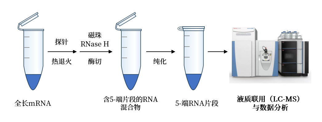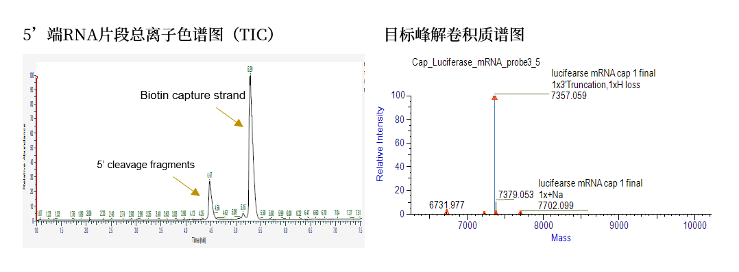 青鸟核酸(RNASci)提供全流程的mRNA加帽率检测方案,包括寡核苷酸夹板(即探针)设计、RNase H切割、离子对反相色谱-质谱(IP-RP-LC-MS)和数据分析。