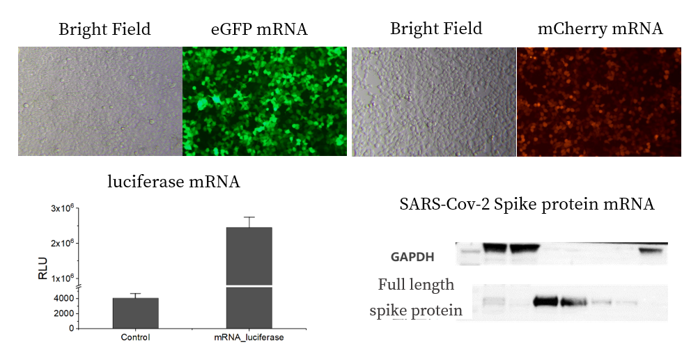 我们将几种裸mRNA分别与商业化转染试剂混合,转染至293T细胞。24小时后检测到目标蛋白信号:eGFP(绿色荧光信号)、mCherry(红色荧光信号)、Luciferase(生物发光信号)、新冠病毒SARS-Cov-2刺突蛋白全长(WB特异性条带)。
