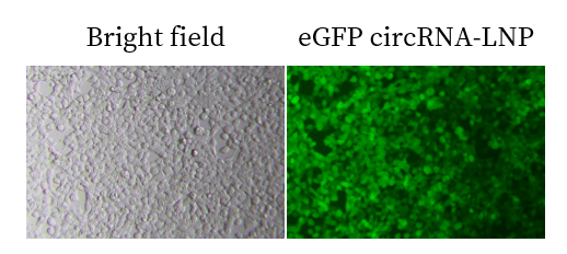 我们使用一款常规四组分LNP包封编码绿色荧光蛋白(eGFP)的circRNA,将其转染至293T细胞。24小时后检测到绿色荧光信号。