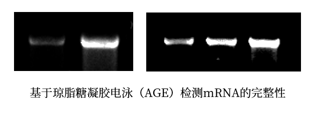 非完整mRNA主要为mRNA发生降解产生的截短片段,在长度上小于结构完整的mRNA(全长mRNA)。基于其长度和分子大小的差异,琼脂糖凝胶电泳、毛细管电泳等方法可用于区分完整mRNA与mRNA截短片段。 琼脂糖凝胶电泳(AGE, Agarose Gel Electrophoresis)是评估RNA完整性的常用方法,不同长度的RNA样品迁移速度不同,最终呈现出不同的条带。 AGE 是实验室阶段常用的mRNA完整性检测方法,操作简单、能够快速获得实验结果。