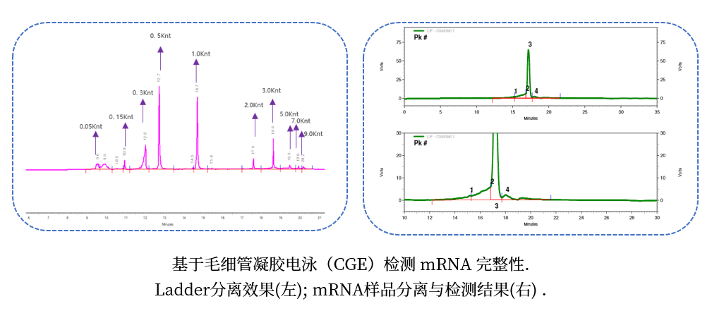 毛细管凝胶电泳(CGE, Capillary Gel Electrophoresis)结合紫外检测器(UV)或光诱导荧光检测器(LIF)是一种高分辨率的RNA完整性分析方法,常用于临床研究样品等其他高质量标准mRNA疫苗/药物的分析检测。CGE同样基于RNA长度进行物质分离,较短的RNA出峰时间更早。基于CGE的检测对于mRNA工艺优化和产品质量保证具有重要意义。 青鸟核酸开发了成熟的CGE分离条件,能够精确鉴别全长mRNA与mRNA截短片段,高分辨率下表征mRNA的完整性,适用于检测更高质量标准的mRNA样品。
