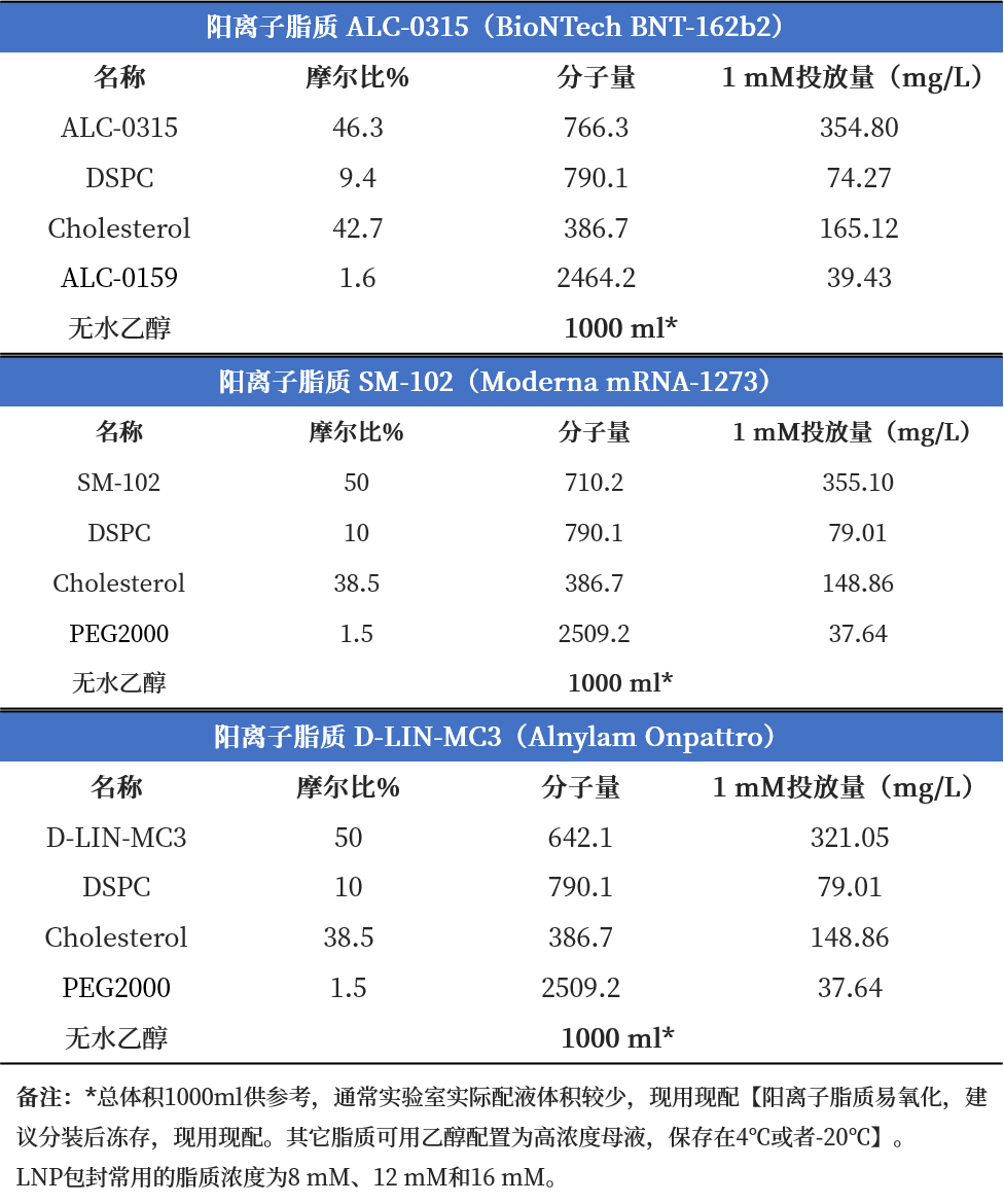 经典LNP配方 经典 LNP 配方 SM-102 LNP、ALC-0315 LNP、MC3 LNP