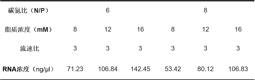 氮磷比(N/P)是RNA-LNP包封中的常用参数,用来计算核酸和脂质的浓度比。基于N/P的脂质-RNA浓度表如下: