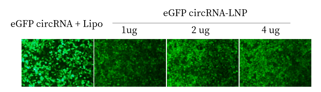 我们使用一款商用的LNP配方包封eGFP circRNA(1ug, 2ug, 4ug),将其转染至293T细胞。48小时后观察到明显的荧光信号,且荧光强度存在剂量递增效应。Lipo-eGFP circRNA为转染试剂+eGFP circRNA,作为转染对照。